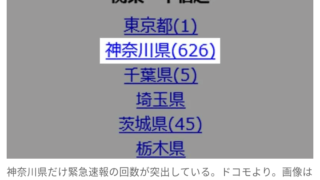 ドコモが提供しているエリアメールの全国の配信履歴を確認してみると、ほかの都道府県では多くても40回程度にとどまっているなか、神奈川県だけ600回以上も発信しています。