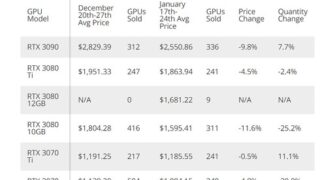 Tom’s Hardwareが示した、eBayにおける2021年12月と2022年1月の価格対比の表では「RTX 3090」は12月で2829.39ドルだったのに対し、1月には2550.86ドルになり、価格は9.8%下がっていた。その他にも「RX 6900 XT」を除く、全てのGPUでも値下がりを確認できる。