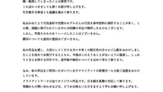「私の作品を愛し、大切にしてくださる方々や多くの取引先の方々にご心配をおかけしましたことを改めてお詫びするとともに、今後はこのようなことがないように猛省し、しっかりと自らを律する所存です。著作権や権利についても改めて考えて参ります」