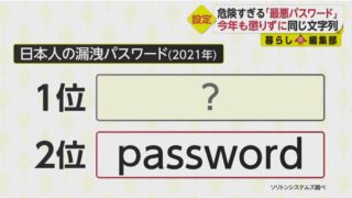 街の声にもあったが、大好きな有名人の名前など使いたくなるが、最悪のパスワードになってしまう。例えば、人気アニメのdraemon(ドラえもん)や、国民的アイドルのarashi(嵐)や花の前のhimawari(ひまわり)、日本文化のsamurai(侍)なども見破られやすいという。
