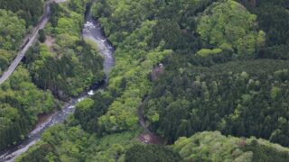 骨の一部が発見されたキャンプ場周辺=山梨県道志村で2022年4月27日午前10時1分、本社ヘリから