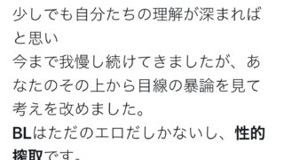 “一個人のゲイの立場から言わせてもらうね。BLはゲイや男性に対する性的搾取・性的消費で不快です。