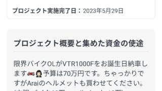 プロジェクトの目標は「5月末のお誕生日にVTR1000F(黄色)を納車したくてこのプロジェクトを立ち上げました!」。「プロジェクト概要と集めた資金の使途」によると、「限界バイクOLがVTR1000Fをお誕生日納車します 予算は70万円です。ちゃっかりですがAraiのヘルメットも買わせてください。(内訳:バイク60万、ヘルメット:10万)」としていた。ホンダ製のバイクとArai製のヘルメットの購入を目指すという。