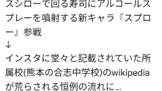 この動画についてSNSでは「回転寿司炎上界隈史上、最悪の迷惑テロ動画見つかる」というフレーズがつけられていた。スシローでは少年が湯呑みを舐めて戻す、いわゆる“ペロペロ動画”があったほか、はま寿司では他人の寿司に勝手にワサビを乗せる動画が話題となってきた。今回はアルコールスプレーを噴射しているだけに、アルコールアレルギーの人にとっては健康被害につながるという意味で、“史上最悪の迷惑動画”と指摘されているのだ。