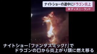 アメリカのディズニーランドで、ナイトショーの途中にドラゴンが燃える事故があった。