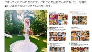 SNSでは「結婚しました!私の“ごはん日記”の、ここ3年分くらいの自炊は旦那さんが作ってくれていたものです。これからも旦那さんのご飯パワーを糧に、楽しい漫画を描いていきたいと思います」と伝えた。