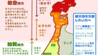 というお願いで混乱された方は、こちらの画像をご覧ください。石川県は南北に約200kmあり、大きく分けて能登地方と加賀地方に分かれています。加賀地方は新幹線や飛行機の交通インフラもほぼ通常通りです。