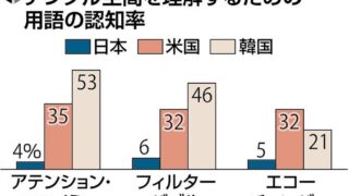 デジタル空間の構造や弊害を表す用語の認知率も調査。正確さより関心を集めることを重視する「アテンション・エコノミー」など三つの用語を知っている人は、平均で日本は5%のみ。米国33%、韓国40%と大きな差がついた。