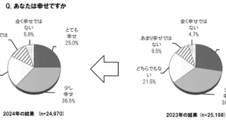 まず、「あなたは幸せですか」と聞くと、「とても幸せ」が25.0%、「少し幸せ」が36.5%で、計61.5%が肯定的な回答となった。一方で、あまり幸せではない・全く幸せではないの合計は17.1%となり、前年から2.9ポイント増加していた。