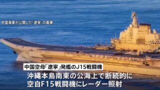 防衛省によりますと、きのう(6日)午後4時32分ごろから4時35分ごろの間に中国海軍の空母「遼寧」から発艦したJ15戦闘機が、沖縄本島の南東の公海上空で領空侵犯を警戒してスクランブル発進した航空自衛隊のF15戦闘機に対し、断続的にレーダー照射を行いました。