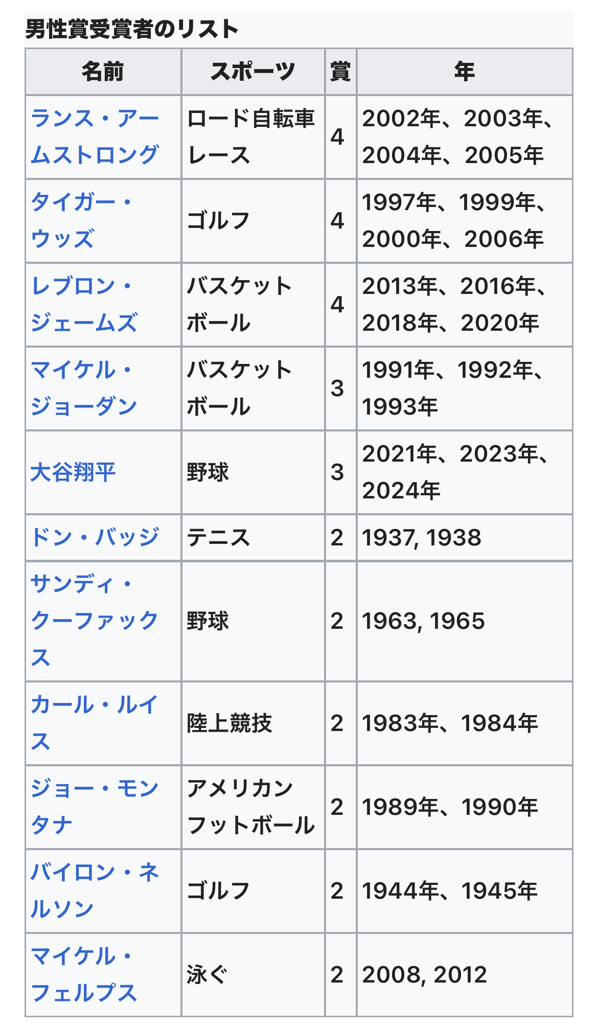 AP通信の全米最優秀アスリート賞を受賞した模様