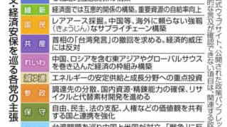 これに対し、高市氏は資源の国産化や調達先の多角化による「脱中国化」を鮮明に打ち出した。自民は衆院選の公約で「他国の経済的威圧に屈しない日本を創る」と明記し、鉱山開発や精錬事業の支援を約束。日本維新の会は、重要資源の自給率向上、国民民主党はレアアース採掘の本格化を掲げる。