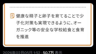 【悲報】参政党「健康な精子と卵子を育てるためにオーガニック給食を推進します!」