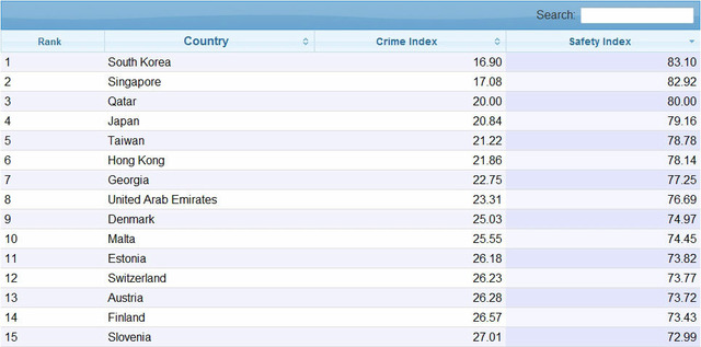 そして安全な国はアジアに集中しており、その中でも最も安全な国は韓国となった。犯罪インデックスは16.90と