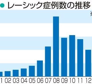 消費者庁が13年、レーシック経験者600人(20~60歳代、複数回答)を調査した結果、 「光がギラギラしてにじむ」(16・5%) 「ドライアイが半年以上続く」(13・8%) などの不具合があったと発表したことも、 減少に拍車を掛けたとみられる。