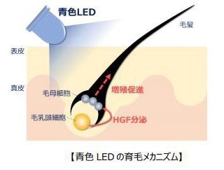薄毛発生には様々な原因がありますが、今回の研究では、青色 LED が、体毛・毛髪の双方に育毛作用を示し、特に薄毛 悩みのある方での実使用(6 か月)においても、顕著な育毛効果が認められました。培養細胞を用いた検討を行ったところ、育 毛作用における HGF(Hepatocyte Growth Factor:細胞増殖因子の一種)の発現促進が認められ、青色 LED の育 毛作用が HGF を介したものである可能性が示唆されました。