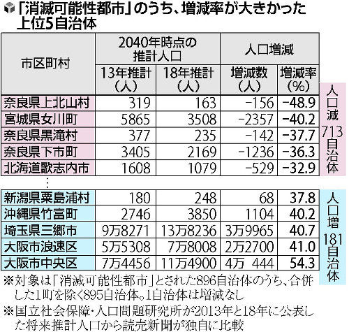 民間の有識者らでつくる日本創成会議(座長・増田寛也元総務相)が2014年5月、「40年に消滅する 可能性がある」(消滅可能性都市)と指摘した全国896市区町村のうち、約8割の自治体で人口減が より加速することが読売新聞社の分析でわかった。