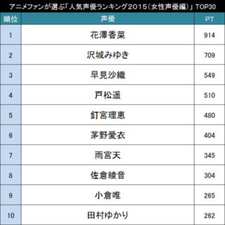 マンガ・アニメ・小説 アニメファン1万人が選ぶ「最新人気女性声優ランキングTOP30」5位釘宮理恵、4位戸松遥、3位早見沙織、2位沢城みゆき、1位は・・・