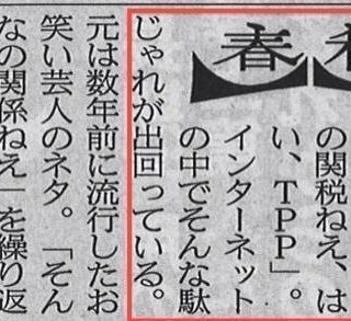 ネット・SNS 新聞「そんなの関税ねぇ!はい、TPP」というダジャレがネットで出回っている