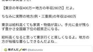 ネット・SNS 【悲報】X女性「東京の年収400万は、地方の280万と生活水準同じ。ド貧困」→都民の逆鱗に触れ炎上wwwwwww