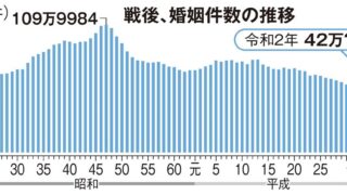 恋愛・結婚 【悲報】昨年の婚姻数、10月まで前年比13%減 戦後最悪レベルの下落幅 少子化加速へ