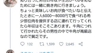 恋愛・結婚 婚活まんさん「男の年収や生活水準を測るなら焼肉に誘ってください。牛角に連れて行ったら貧乏です」