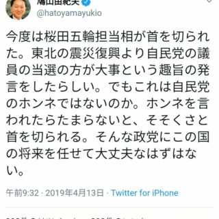 政治 鳩山由紀夫「ホンネを言ったら首を切られる。そんな政党に国を任せて大丈夫なはずはない」