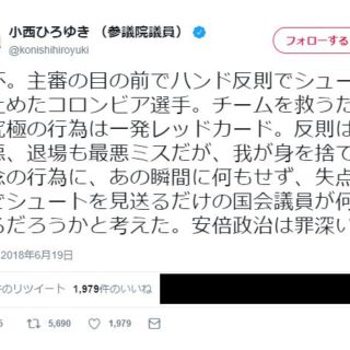 スポーツ 小西ひろゆき「主審の目の前でハンド反則でシュートを止めたコロンビア選手。(略)安倍政治は罪深い」
