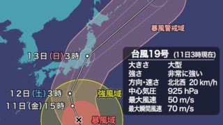 社会・時事 【悲報】1000年に1度の超弩級台風19号、まだ遥か彼方なのに首都圏は暴風域に、千葉県は早くも7000軒が停電