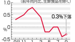 社会・時事 【悲報】9月消費者物価、0.3%下落…GoToトラベル、宿泊料が30%減と大幅に低下したことが影響