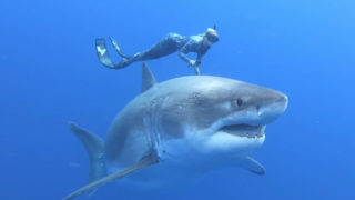 命知らずの美人ダイバー ホホジロザメとともに悠然と泳ぐ