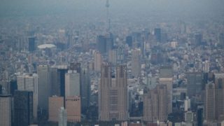 新宿の高層ビル群。中央は東京都庁=東京都新宿区で2020年4月、本社ヘリから吉田航太撮影