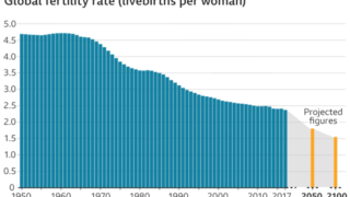 米ワシントン大学の保健指標評価研究所(IHME)の研究者たちは、2017年には世界の出生率が2.4と、ほぼ半減したとしている。2100年までには1.7を下回ると予測している。