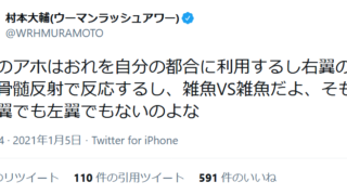 左翼のアホはおれを自分の都合に利用するし右翼のアホは骨髄反射で反応するし、雑魚VS雑魚だよ、そもそも右翼でも左翼でもないのよな