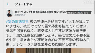 西村大臣は、みずからのツイッターで1都3県では、前回緊急事態宣言が出された去年4月のデータと比べて11日までの3連休に人出が減らなかったと指摘しました。