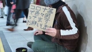手に掲げていた段ボールの切れ端には「コロナ等で色々困ってます。お願いします」と書かれた文字。