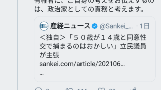 本多議員は「50歳近くの自分が14歳の子と性交したら例え同意があっても捕まるというのはおかしい」と発言したということです。
