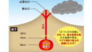 「東日本大震災で富士山の地下20kmにあるマグマ溜まりが揺すられ、噴出しやすい状態になりました。その4日後、3月15日には富士山の地下14kmで地震が起こり、マグマ溜まりの上の岩盤が割れた。この2つの条件が重なり、富士山は噴火しやすい状態に入ったのです」(鎌田氏)