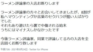 「ラーメン評論家、同業で評論してる方の入店を全店固くお断り致します」との声明を発表しました。