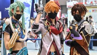 2023年3月25日、東京にある東京ビッグサイトで開催された日本のアニメ業界最大のイベント、第10回アニメジャパンに参加した人たちが、コスプレ衣装で仮装して写真のポーズをとっている。(AFP)