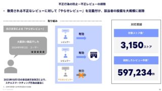 LINEヤフーは9月12日、「Yahoo!ショッピング」で、出店者が自ら商品を注文し、高評価を投稿するなどの“やらせレビュー”の可能性が高い投稿を、約60万件削除したと発表した。同日公表したYahoo!ショッピングの「安全・安心への取り組みレポート」で報告した。