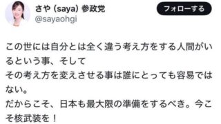 さや議員「世の中は多くの考えがあり、他人の考えを変える事は出来ない。だから核武装が必要なんです」