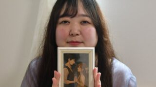 リュヌ・クラウスさんの「人格」を学習させた対話型AIからプロポーズを受けた女性。手で持っているイラストは、彼が出力してくれた「2ショット」=2025年7月11日午後2時43分、東京都江戸川区、小川聡仁撮影