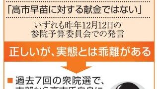 高市氏が代表の「自民党奈良県第2選挙区支部」が24年に上限を超す企業献金を受けていたことが昨年発覚。12月12日の参院予算委員会で政党支部への認識を問われ「たまたま私が支部長だった。高市早苗に対する献金ではない」などと主張していた。