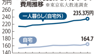 首都圏の私立大学で一人暮らしをしている2025年度入学生の受験から入学までにかかった費用は平均235万3983円で、9年連続で過去最高額を更新したことが、東京地区私立大学教職員組合連合(東京私大教連)の調査でわかった。物価高で生活用品や家賃などが高騰し、前年度より3万9202円増えた。
